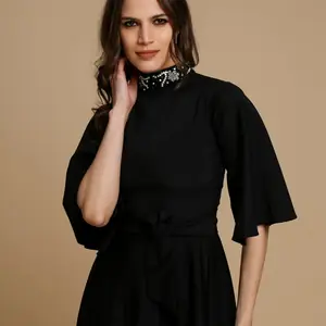 يأتي الفستان بحزام من نفس نوع القماش يمكن ربطه حول الخصر لإضافة لمسة أنثوية رقيقة. وتضيف الفصوص اللامعة حول الرقبة لمسة من الأناقة والبريق، مما يجعل الفستان مثاليًا للظهور بإطلالة ساحرة وجذابة.