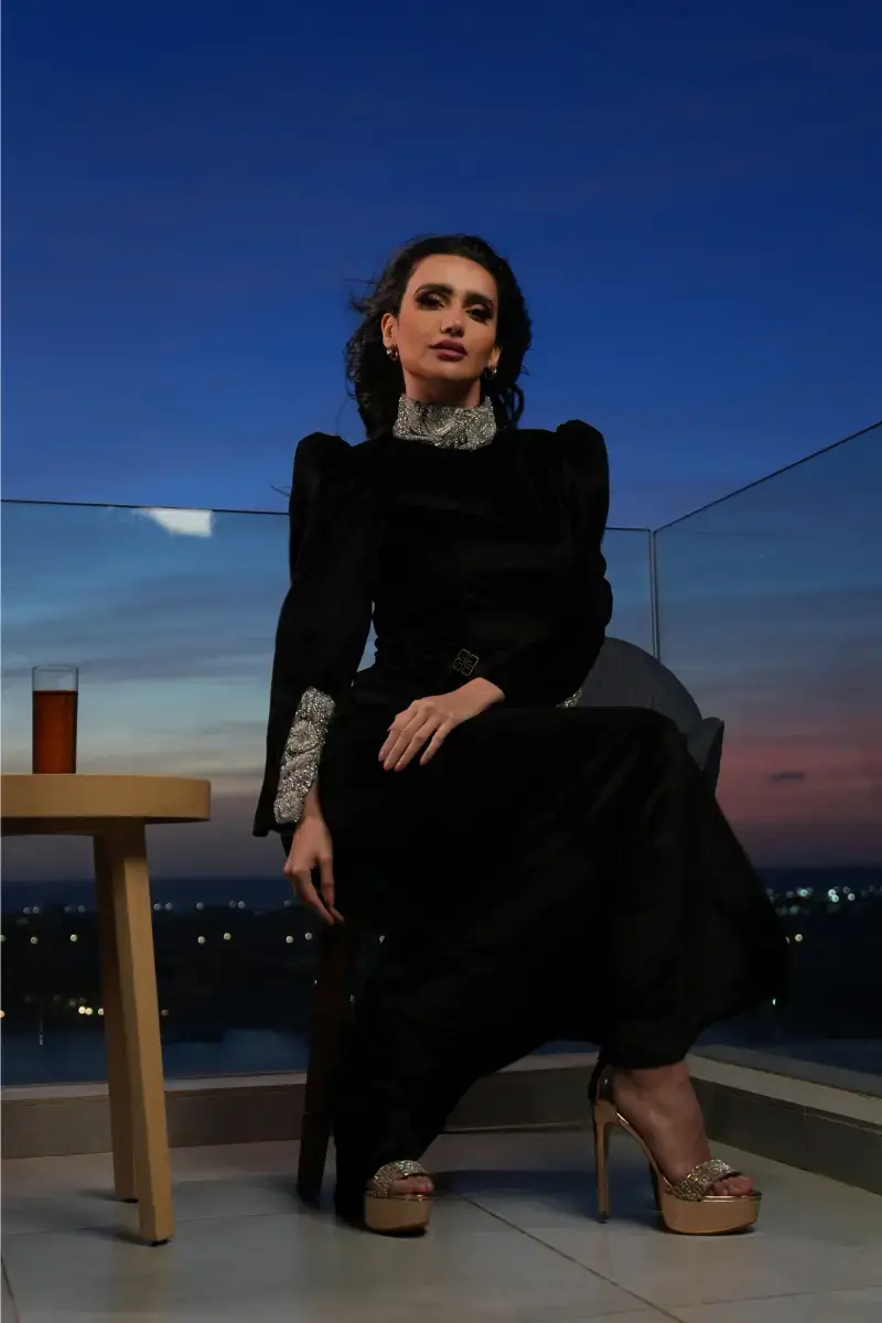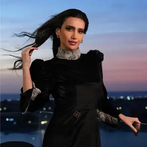 تنتهي الفستان باتساع يعطي لمسة ساحرة وأنيقة على المشهد. يمكن تنسيق هذا الفستان مع أكسسوارات بسيطة وكعب عالٍ لتكملي الإطلالة الفاخرة. ببساطة، إنه فستان مخمل يجمع بين الفخامة والأناقة، مما يجعله خيارًا مثاليًا للسهرات الراقية والمناسبات الخاصة.